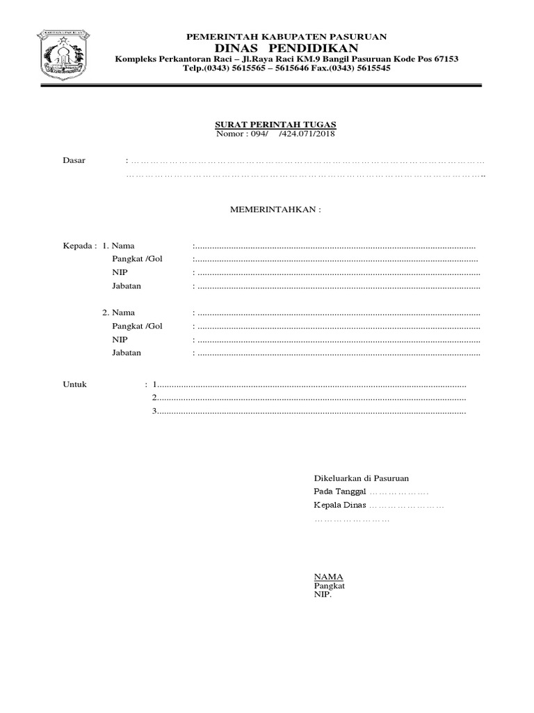 Surat dinas digunakan tak terbatas hanya di instansi pemerintah saja, namun juga digunakan di berbagai instansi seperti sekolah dan swasta. Surat perintah perjalanan dinas atau yang disingkat dengan sppd adalah surat perintah perjalanan yang dikeluarkan oleh instansi pemerintah maupun perusahaan swasta dari berbagai bidang seperti pendidikan, sosial, kesehatan dll. Pemerintah kabupaten paser sekretariat daerah sekretariat: Surat tugas adalah surat yang berisi penugasan seorang pejabat/pegawai untuk melaksanakan tugas khusus yang contoh sederhananya: Pada umumnya surat dinas dibuat oleh instansi atau lembaga baik pihak swasta ataupun negeri misalnya seperti sekolah, perusahaan.