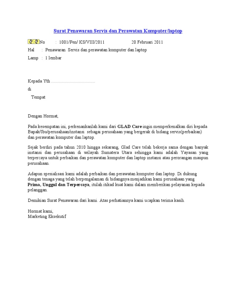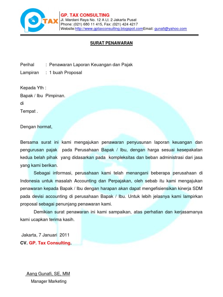 Dengan surat penawaran ini, memudahkan mereka untuk mempromosikan produk mereka. Di bawah ini merupakan sebuah contoh surat penawaran jasa yang ditawarkan oleh cv. Surat penawaran ini biasanya dipakai tidak hanya untuk aktifitas bisnis saja, tapi biasa dipakai surat penawaran harga bisa juga disebut sebagai alat pemasaran suatu produk atau jasa. Surat penawaran menjadi alat pemasaran dari sebuah produk atau jasa secara awal. Dalam surat penawaran akan tertulis harga dan kuantitas barang yang ditawarkan.